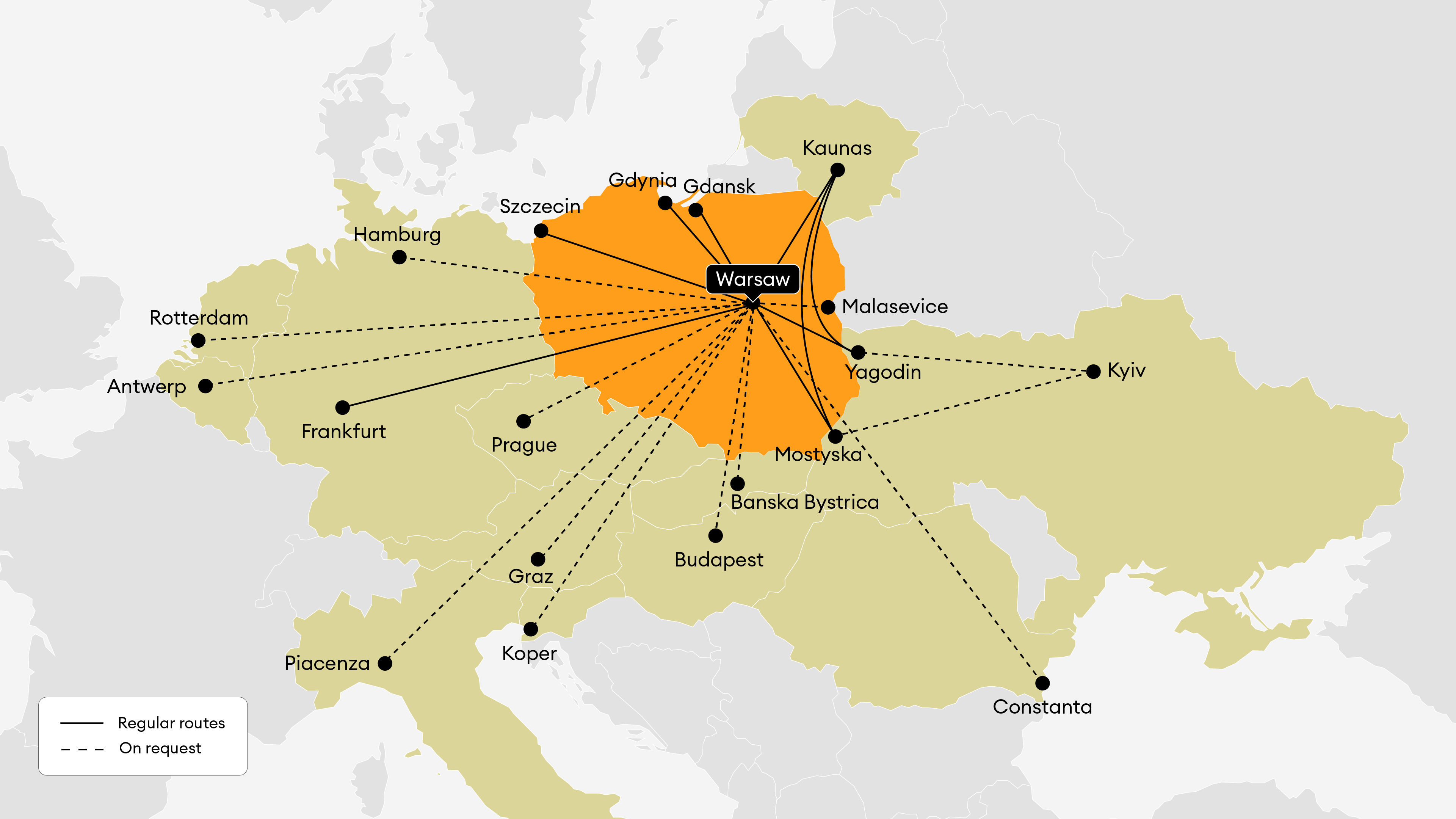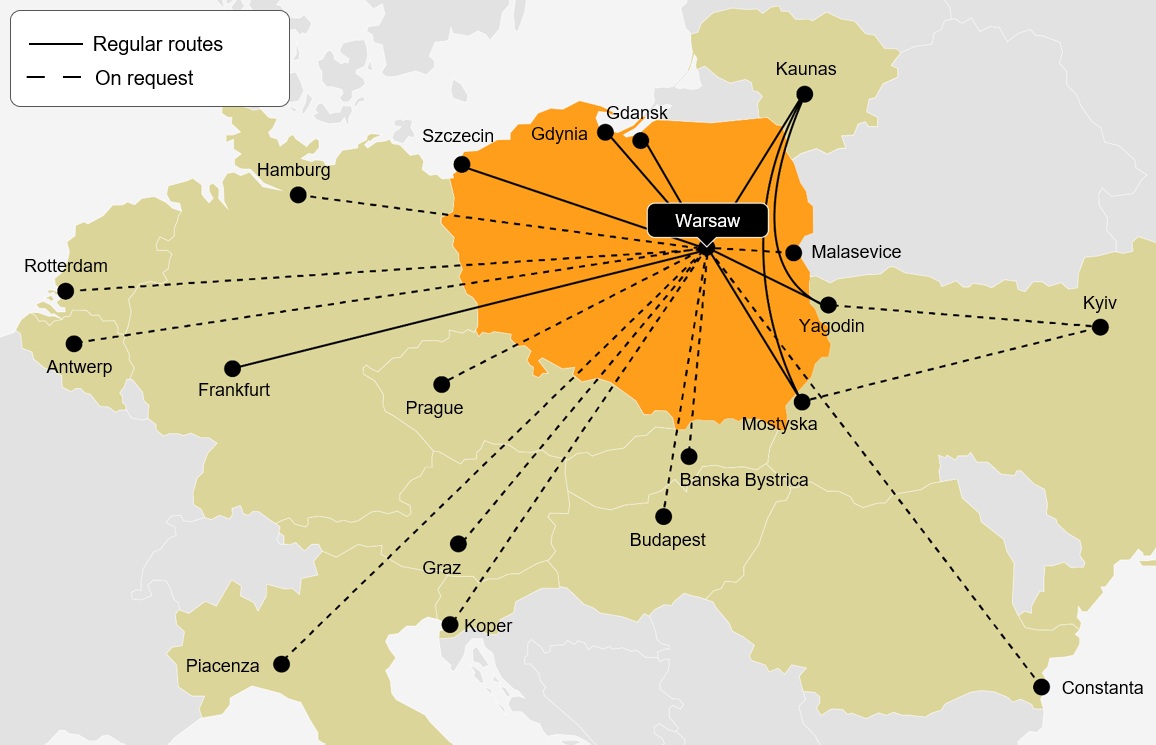 For customers who want to transport their cargo to Western Europe, we offer a regular intermodal route Kaunas–Lodz–Duisburg.