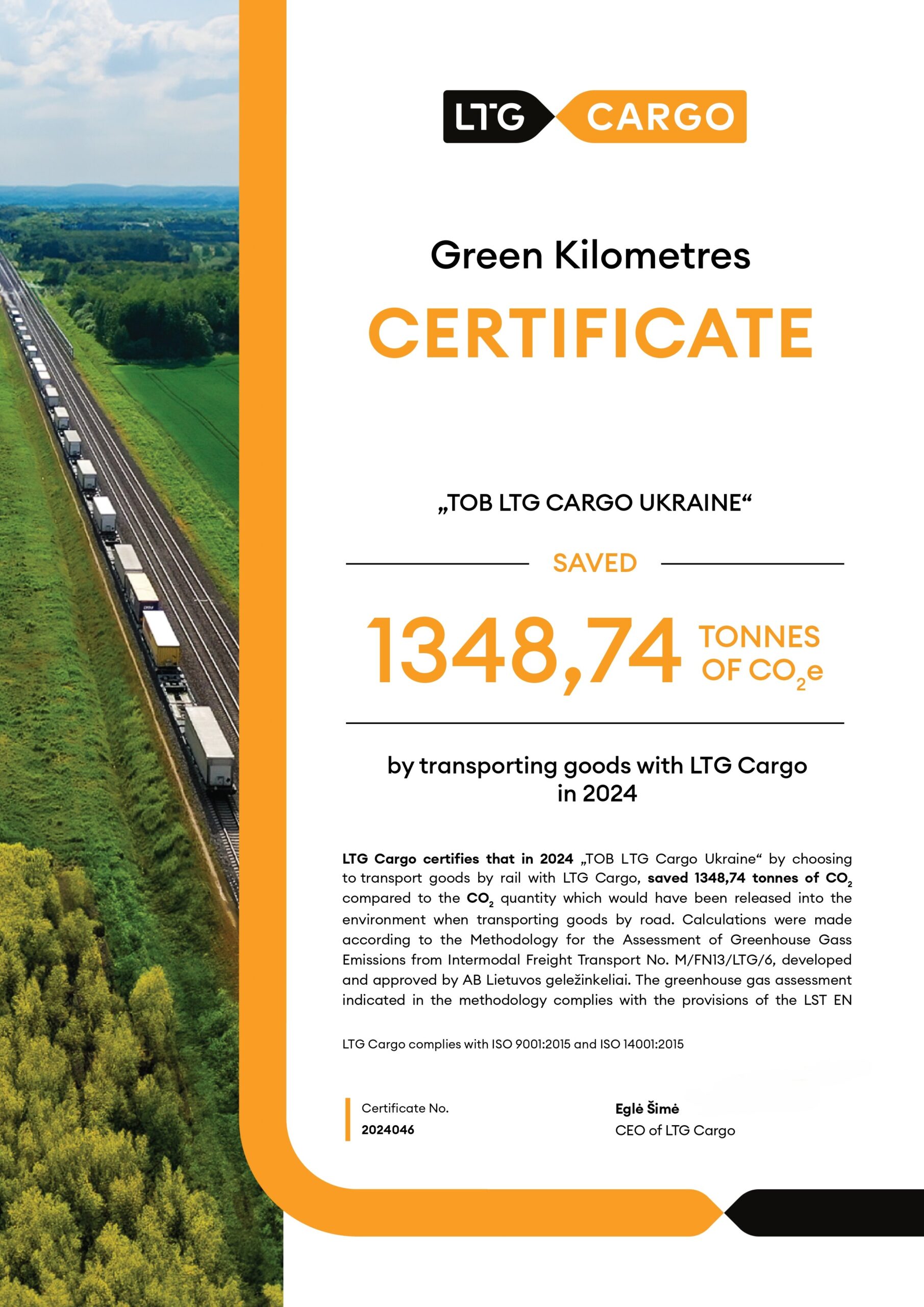 In order to reveal and measure our customers' contribution to environmental sustainability, we have developed a methodology to record CO₂e savings of intermodal freight in 2022 (the Intermodal Freight GHG Emissions Assessment Methodology), which was updated in 2024 due to the change of the standard from LTS EN 16258:2013 (repealed) to LST EN 14083:2023. Emissions from rail transport are calculated on the basis of actual diesel fuel consumption, with updated factors. The coefficient for road transport was chosen according to the dominant type of tractor vehicles in Europe, taking into account the characteristics provided (previously, a general coefficient was applied to road vehicles without considering the characteristics of heavy-duty vehicles carrying intermodal freight). The calculations based on the updated methodology are much closer to Ecotransit, Europe's most widely used and recognised CO₂e calculator.
