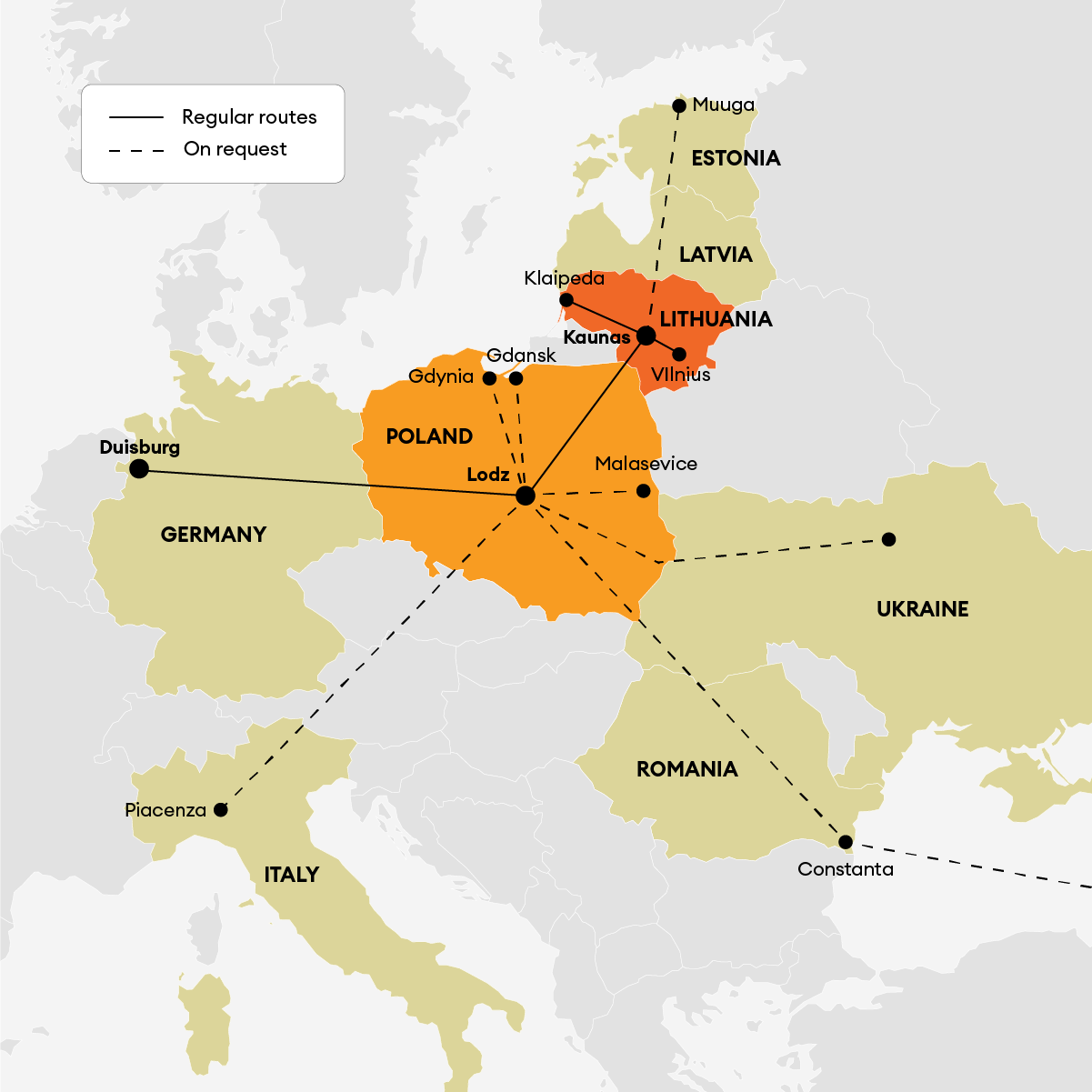 Intermodal transport is one of the most environmentally friendly and efficient freight transport solutions. Semi-trailers or containers are loaded onto a train platform using special equipment and transported by rail.