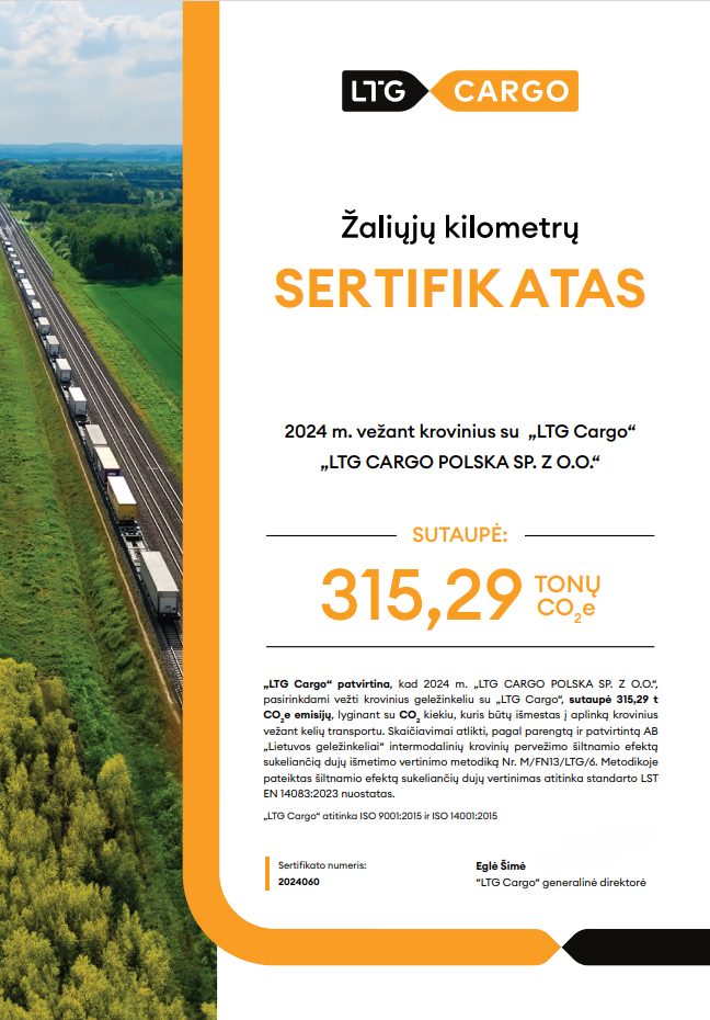 „LTG Cargo Polska“ savo veikloje vadovaujasi tvarumo ir įsipareigojimo aplinkai principais: efektyviai naudoja energijos ir gamtos išteklius, atsakingai rūšiuoja veikloje susidariusias atliekas ir ieško sprendimų, leidžiančių prisidėti prie darnesnės ir aplinkai draugiškesnės logistikos vienu tvariausių – geležinkelių – transportu.