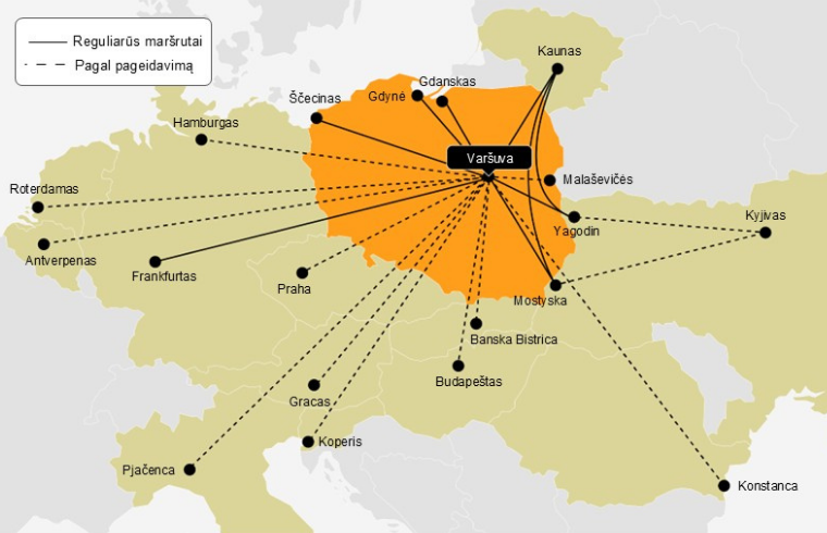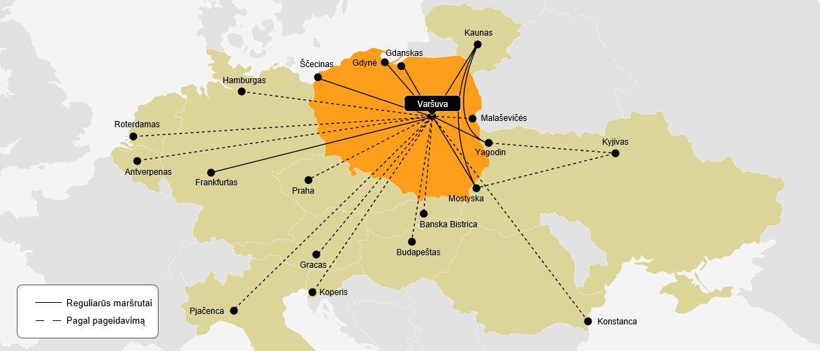 Klientams, norintiems savo krovinį vežti į Vakarų Europą, siūlome reguliarių intermodalinį maršrutą Kaunas–Lodzė–Duisburgas.